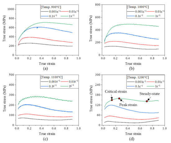 Figure 2 shows the measured flow stresses for the nickel alloy A230. It can be seen that the flow stresses tended to decrease as the temperature increased and the strain rate decreased, which are general high-temperature deformation characteristics. This is because the mobility of the grain boundaries increases as the temperature increases [24,25]. The low strain rate also caused stress reduction because it provided sufficient time for the growth of DRX grains. At the initial stage of deformation, the flow stresses rapidly increased due to the work hardening for all of the deformation conditions. After the strain reached the critical strain, DRX occurred actively so that the flow stress was gradually reduced after the peak stress (Figure 2d). As a result, a steady-state in which work hardening and stress softening were balanced was observed. However, the steady state was not clearly observed when the temperature was relatively low and the strain rate was relatively high. On the other hand, when the temperature was high or the strain rate was low, secondary work hardening in which the stress increased again after the steady state was observed.