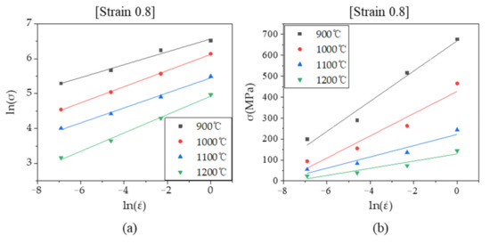 n′ and β are obtained by finding the slope values of the linear fitting lines of the ln σ vs. ln and σ vs. ln graphs, respectively (Figure 3). Each n′ and β value according to temperature is averaged and used. As a result, one n′ and β value are calculated for each strain. After that, the value of α for each strain is obtained by α = β/n′.