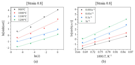 Figure 4 shows the linear relationship between ln[sinh(ασ)] vs. ln , and ln[sinh(ασ)] vs. 1000/T at strain 0.8. The value of n was obtained by averaging the slope of the linear fitting line in Figure 4a. On the other hand, in the case of Figure 4b, the Tp values according to the strain rate were used for further calculation (not averaged). This is because the strain rate dependent Tp values are more effective for predicting the flow stress [26].
