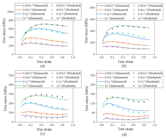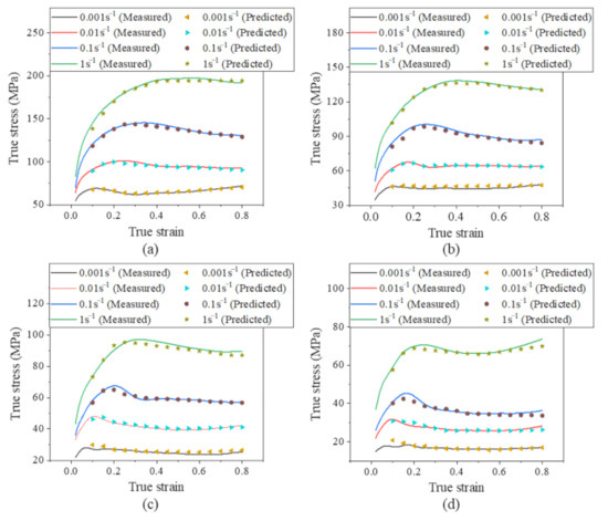 Experimental and predicted flow stress curves using the Arrhenius constitutive model for (a) 900, (b) 1000, (c) 1100, and (d) 1200 °C.