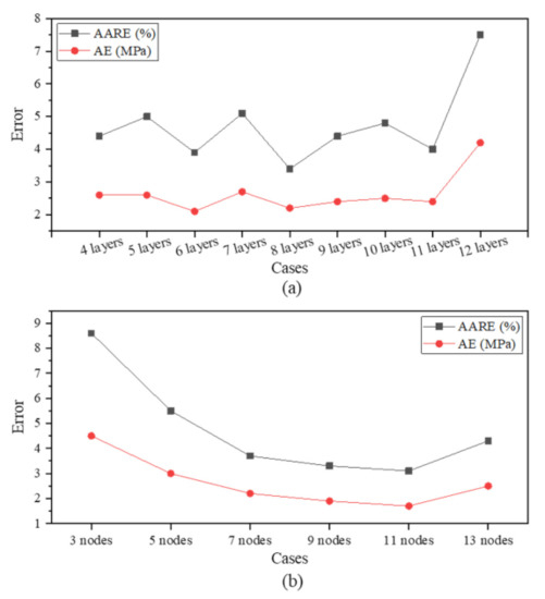 Graphs depicting the results of AARE and AE calculation according to (a) the number of hidden layers and (b) the number of nodes.