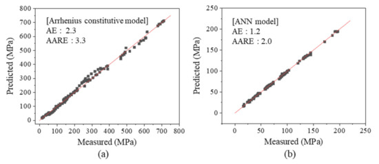 Figure 9 shows the correlation between the measured and predicted values. In the case of the Arrhenius constitutive equation model, the error increased near the stress of 300 MPa. On the other hand, the ANN model predicted stress accurately over the entire stress range. The AE and AARE values for the entire evaluation data were calculated as 1.2 and 2.0 for the ANN model, and 2.3 and 3.3 for the Arrhenius constitutive equation model, respectively. Therefore, it can be confirmed that the ANN model exhibited a more accurate performance for predicting flow stresses.