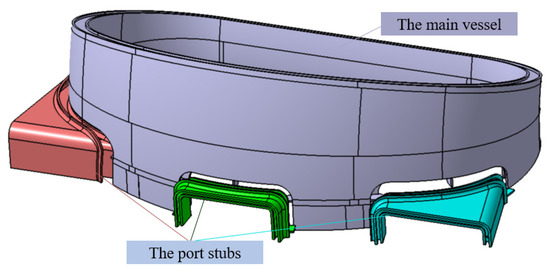 As the next-generation fusion device in China, the China Fusion Engineering Test Reactor (CFETR) is a large-scale test platform that bridges the Fusion Demonstration Reactor (DEMO) with the International Thermonuclear Experimental Reactor (ITER) [1]. The CFETR vacuum vessel (VV) ports provide access to the plasma chamber for remote handling, heating, diagnosis, and the maintenance and replacement of the in-vessel components [2]. The ports are attached to port stubs, which are integral to the inner and outer shells of the main vessel, as shown in Figure 1. As the safety important class (SIC) components, all welds of the VV must be fully penetrated [3]. However, the VV has extremely high manufacturing tolerance requirements, and the port stub as its sub-component has stricter tolerance requirements [4]. The port stub has complex three-dimensional features, and there are many fully penetrated joints. In order to control its dimensional accuracy, electron beam (EB) welding is used because of its low heat input, small welding heat affected zone, and small deformation [5]. However, welding deformation always exists; to further control the deformation, it is necessary to predict the deformation and design corresponding fixtures to reduce the deformation.