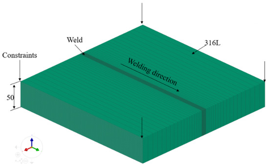 The 316L stainless steel flat plate with a size of 300 mm × 150 mm × 50 mm was taken as the finite element analysis object [16]. The welding joint was butt joint without grooves. The EB welding was adopted. The welding voltage was set to 150 kV, the beam current was set to 95 mA, the welding speed was set to 5 mm/s, and the working distance was set to 300 mm. These welding parameters have passed the qualification. The initial temperature of the flat plate was set to 20 °C, the thermal radiation loss was calculated using the Stephen–Boltzmann equation, and the surface radiation efficiency was taken as 0.8. Since EB welding was carried out in a vacuum, the convection loss was 0 W/m2. Figure 3 shows the finite element model.