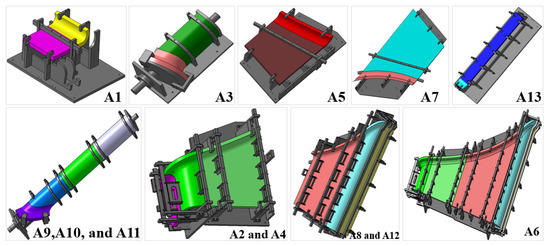 Based on the above analysis of the welding deformation, a set of combined welding fixtures is designed, as shown in Figure 8. The fixtures used for the welds of A1 and A5 can be used in combination and used for welding A2 and A4. The fixtures used for the welds of A7 and A13 can be used in combination and used for welding A8 and A12. These four fixtures can be combined for welding A6. Since the welds of A3 and A9, A10 and A11 are all welds of spin welding, the welding fixtures are designed separately.