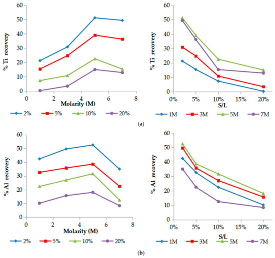 Concerning the co-extraction of the main elements, Ti, Al and Fe present a similar behavior with Sc, as is demonstrated in Figure 3a–c, respectively. Acid molarity increment up to 5 M results in higher recoveries and concentrations of the elements at the expense of selectivity, while increased S/L ratios negatively affect main elements’ recovery. Molarities higher than 5 M do not further improve the extraction.