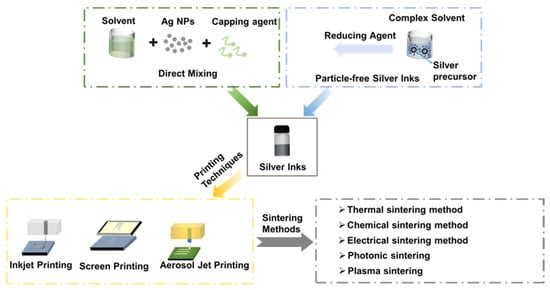 - Mo, L.; Guo, Z.; Yang, L.; Zhang, Q.; Fang, Y.; Xin, Z.; Chen, Z.; Hu, K.; Han, L.; Li, L. Silver Nanoparticles Based Ink with Moderate Sintering in Flexible and Printed Electronics. Int. J. Mol. Sci. 2019, 20, 2124. [Google Scholar] [CrossRef]