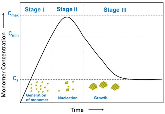 - LaMer, V.K.; Dinegar, R.H. Theory, Production and Mechanism of Formation of Monodispersed Hydrosols. J. Am. Chem. Soc. 1950, 72, 4847–4854. [Google Scholar] [CrossRef]