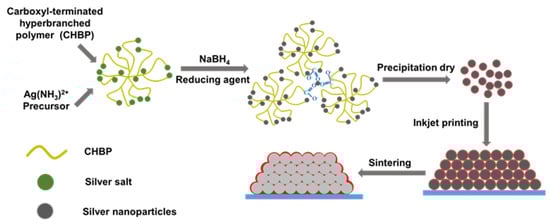 - Hao, Y.; Gao, J.; Xu, Z.; Zhang, N.; Luo, J.; Liu, X. Preparation of Silver Nanoparticles with Hyperbranched Polymers as a Stabilizer for Inkjet Printing of Flexible Circuits. New J. Chem. 2019, 43, 2797–2803. [Google Scholar] [CrossRef]