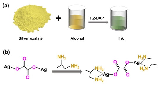 - Mou, Y.; Cheng, H.; Wang, H.; Sun, Q.; Liu, J.; Peng, Y.; Chen, M. Facile Preparation of Stable Reactive Silver Ink for Highly Conductive and Flexible Electrodes. Appl. Surf. Sci. 2018, 475, 75–82. [Google Scholar] [CrossRef]