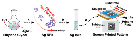 - Ding, J.; Liu, J.; Tian, Q.; Wu, Z.; Yao, W.; Dai, Z.; Liu, L.; Wu, W. Preparing of Highly Conductive Patterns on Flexible Substrates by Screen Printing of Silver Nanoparticles with Different Size Distribution. Nanoscale Res. Lett. 2016, 11, 412. [Google Scholar] [CrossRef]