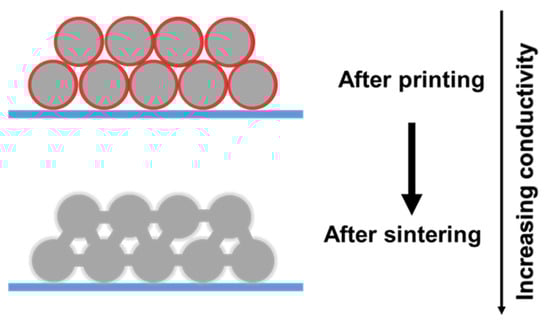 - Grouchko, M.; Kamyshny, A.; Mihailescu, C.F.; Anghel, D.F.; Magdassi, S. Conductive Inks with a “Built-In” Mechanism That Enables Sintering at Room Temperature. ACS Nano 2011, 5, 3354–3359. [Google Scholar] [CrossRef]