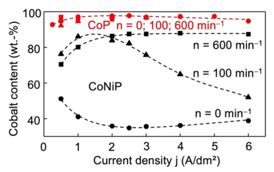 The composition of ternary CoNiP is highly dependent on the current density and rotation speed as shown in Figure 2. A higher rotation speed results in a smaller diffusion layer in front of the cathode. It can be observed that the rate of cobalt reduction is affected by diffusion, since a rotation speed of n = 600 min−1 leads to a high Co content over the current density range, while deposition without forced convection (n = 0 min−1) results in a reduced cobalt content, thus producing layers with poor magnetic properties. The composition of binary CoP on the other hand is less dependent on the mass transfer and current density, and therefore, it is easier to obtain layers with a defined composition.