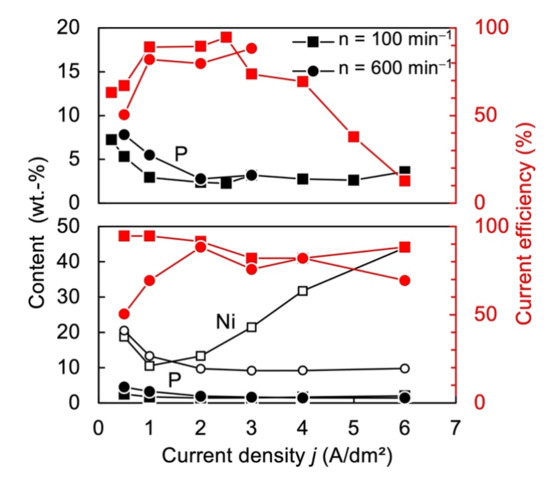 The Co content for CoNiP in Figure 2 shows that by increasing the rotation speed more cobalt is incorporated at any given current density. For a lower rotation speed and higher current densities, Co is transported relatively slowly to the cathode surface compared to Ni.