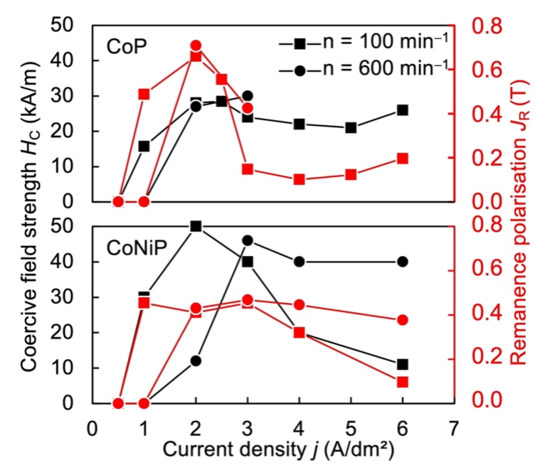Figure 4 shows that for CoP a magnetic strength of up to 0.7 T can be obtained in a narrow current density range around 2 A/dm2. Although the HC and JR values for CoNiP remain steady over a wider current density range, it is less suitable for the designated application due to the generally lower remanence polarization (half of CoP) and the strong influence of the convection, as indicated by a more pronounced shift to higher current densities for n = 600 min−1. Figure 3 and Figure 4 show that the coercivity and the remanence polarization of CoNiP have an inverse relationship with the Ni content. It can be concluded that CoP yields much stronger magnets with reduced effort regarding process control. CoNiP on the other hand yields double the coercivity of CoP but the process requires precise control of the mass-transfer characteristics and the current density. Thus, regarding industrial production, CoP is the material of choice.