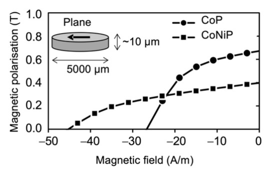 As shown in Figure 5 it was possible to deposit 10 µm thick compact CoP and CoNiP discs with intrinsic (in-plane) remanence polarizations of JR = 0.65 T and JR = 0.40 T and coercivities of HC = 28 kA/m and HC = 45 kA/m, respectively.