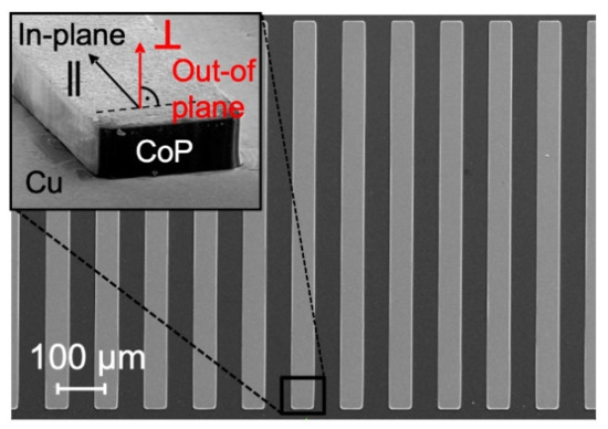 A scanning electron microscopic (SEM) image of a CoP magnetic scale bar is shown in Figure 6. The scales were found to exhibit dominant in-plane shape anisotropy, which prevented the out-of-plane magnetization that is desired for the application (see Figure 1).