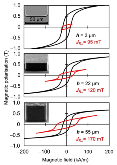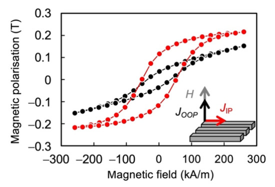 To further improve the out-of-plane magnetization portion, geometrical variations have been investigated regarding their potential to induce vertical anisotropy. By increasing the thickness, the in-plane shape anisotropy can be reduced, thus improving the out-of-plane magnetization. Figure 8 shows that the out-of-plane loops have a lower remanence polarization JR compared to the in-plane loops as expected. The out-of-plane loops are smaller because the VSM used (maximum magnetic field of 260 kA/m) is not capable of bringing the samples to a saturated state due to its high demagnetizing factor, especially for thin layers. The loops shown in Figure 8 are modified for the demagnetizing field by using an extrapolation method according to [16].