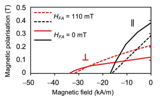 The obtained out-of-plane remanence polarizations of 170 mT for the as-plated, and 205 mT for the field-assisted depositions (Figure 9) exceed the 80 mT and 190 mT previously reported for the same material [13].