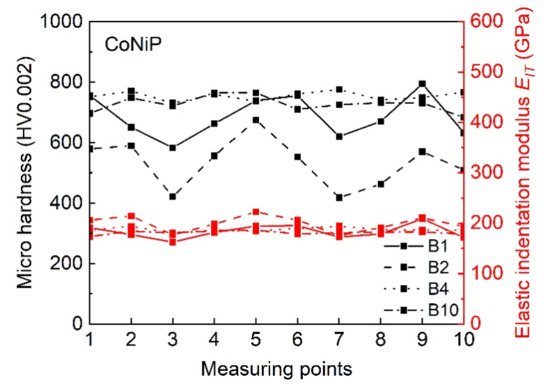The method of micro-hardness testing allows the characterization of thin layer systems deposited on substrates. Analysis of the load–displacement curve of the indentation test gives additional information regarding the elastic properties of the layer system because the measured elastic modulus from the load–displacement curve is related to the Youngs modulus. The samples B1, B2, B4 and B10 all had the same CoNiP- layer thickness of 10 µm. In Figure 11, the Vickers micro-hardnesses of four deposited CoNiP layers were determined using a Fisherscope HM 2000. The testing force used for the Vickers micro-hardness measurement series is 0.01961 N (HV0.002). The application time until reaching the specified testing force is 7 s. The subsequent exposure time of the testing force is 14 s. A total of ten individual measurements were performed on each deposited CoNiP layer. The typical indentation depth was 0.37 µm. The distance between the indentations is at least 6 times the average indentation diagonal length. Sample B1 was deposited with a current density j of 2 A/dm2. It shows a micro-hardness of approx. 583 to 795 HV0.002. The elastic indentation modulus of sample B1 averages about 183.5 GPa. The micro-hardness of sample B2 also shows a higher scattering of 418 to 674 HV0.002 (current density: 1 A/dm2). The elastic indentation modulus, on the other hand, does not show any significant scatter. On average, this is about 200 GPa. The micro-hardness and the elastic indentation modulus of specimens B4 and B10 are comparable and show the lowest scatter within this comparison. The values range from 683 to 771 HV0.002 (micro-hardness), and with 185 GPa being calculated for the average elastic indentation modulus. Here, sample B4 was deposited with a current density of 1 A/dm2 and B10 at 0.5 A/dm2. The elastic indentation modulus shows a smaller range of variation in contrast to the micro-hardness series. The elastic indentation modulus is essentially determined by the atomic binding energy of the lattice, so the measured values are in the expected range (variations are rather small, compare Table 1).