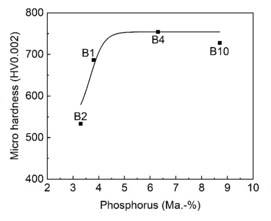 By plotting the micro-hardness values of the samples (B1, B2, B4 and B10) vs. the phosphorus content (Figure 12), it can be seen that with an increasing phosphorus content the micro-hardness values become more homogeneous (also compare with Figure 11), and the average value increases. This behavior is in accordance with the results of other groups reported in the literature [17,18].