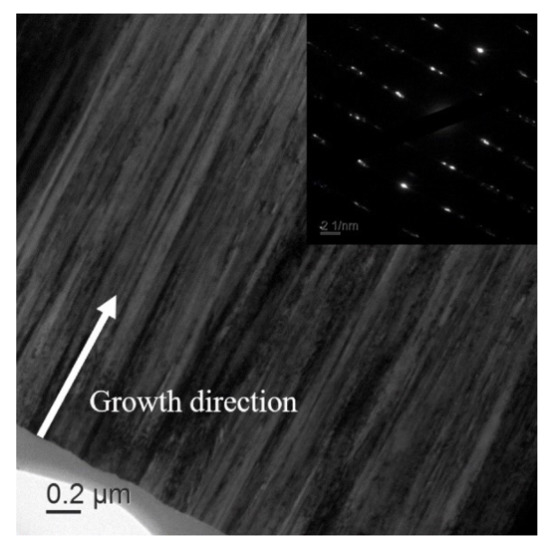 Figure 13 shows a transmission electron microscope (TEM) micrograph and an electron diffraction pattern of the cross-section of a CoP microscale. The TEM results show a rather nano-sized fibrous grain growth compared to the normally expected columnar growth associated with larger grains. This can be explained by the room temperature electroplating process and the use of a grain refinement additive, both of which help to suppress the mobility of surface atoms and thus promote the formation of smaller grains during electrodeposition.