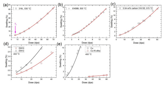 In Equation (9), the separated material parameters and irradiation parameters make validating the functional relationship between swelling and dose of the experiments at the same temperature for the same alloy possible. As the energy for electron irradiation is limited to 1 MeV [12], we can only find low dose and intermediate dose data for electron irradiation, thus, we just apply our model to these experiment results. As shown in Figure 2, the void swelling behavior can be well fitted by our model for different kinds of electron-irradiated alloys, where the fitting coefficients of determination (r-squares) are all greater than 97%, as shown in Table 1, where r-square is a statistical measure of how close the data are to the fitted regression line. Void swelling starts to continuously grow once the irradiation dose reaches a threshold value. This can be explained by the nucleation process or incubation period for void swelling that is frequently observed in experiments [18,19]. By extrapolating to the dose where the swelling equals to zero, we obtain the threshold dose Δ0 after which pronounced swelling begins (indicated by an arrow in Figure 2a):