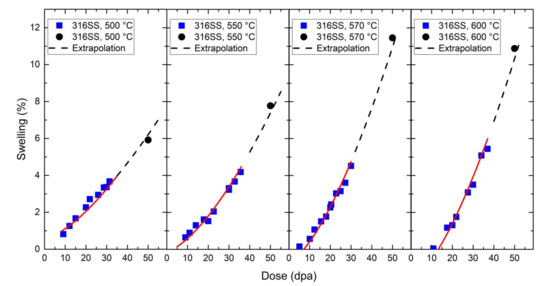 Suppose that material parameters (α and c) remain unchanged when it comes to high-dose irradiation. Equation (9) can also serve as the basis for extrapolating high swelling level for an identical material at the same temperature and fixed irradiation dose rate from low-dose condition. In each subgraph of Figure 3, 316 SS was irradiated in the same HVEM at the same temperature. The parameters α and c were calculated from the low-dose irradiation data (blue square symbols) [14] which are listed in Table 2. Equation (9) can be used to extrapolate the swelling rate at higher doses. Our extrapolations are consistent with another set of high-dose irradiation at the same HVEM (black circle symbols) [14]. Therefore, these examples suggest that our derived model can also be validated by extrapolating void swelling at high doses from the low dose data for electron irradiation.