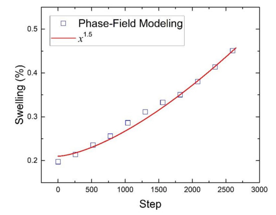 The dose dependence of irradiation-induced swelling by phase-field simulation is shown in Figure 4, where the simulation step can be represented as the evolution time of the void growth or the irradiation dose, the volume fraction of the void can be represented as the radiation-induced swelling. The dose dependence of swelling can be well fitted using a power of 1.5, which is in accordance with our model in Equation (9). We agree that many experimental data [18] show the linear irradiation dose dependence of void swelling at high dose, where swelling rate is about 1%/dpa. For these experimental data, our model shows better fitting results, which can be found in Figures S2–S4 of Supplementary Materials.