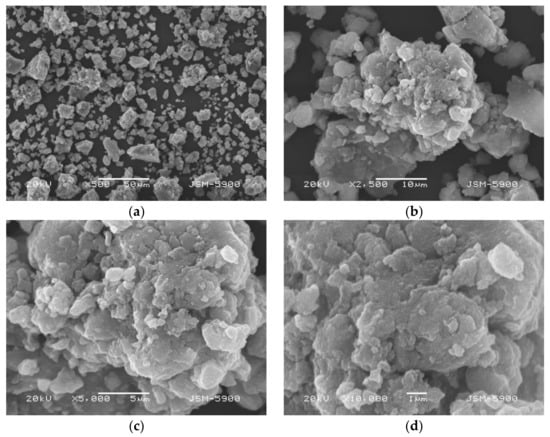 Micrographs captured by SEM at various magnifications ((a) ×500, (b) ×2,500, (c) ×5000, and (d) ×10,000) of Mg-5Ni dehydrogenated at the eighth cycle.