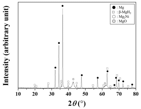 An X-ray diffractogram of Mg-5Ni dehydrogenated at the eighth cycle is shown in Figure 2. The sample contains Mg and small amounts of β-MgH2, Mg2Ni, and MgO. Mg2Ni is believed to have been formed during heating at the first cycle [12]. Mg and Mg2Ni absorb hydrogen and then release hydrogen during hydriding-dehydriding cycling at temperatures of the present work.