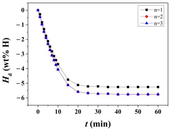 The quantity of hydrogen released from the sample was expressed by Hd in the unit of wt% H, which was defined as the percentage of the released hydrogen on the basis of the sample weight. Variation in the Hd versus t curve with the number of cycles, n, at 593 K under 1.0 bar H2 for hydrided Mg-5Ni is shown in Figure 3. At n = 1, the initial dehydriding rate is quite high, the dehydriding rate is the highest after about 5 min, and the dehydriding rate becomes low after 20 min. At n = 2, the initial dehydriding rate and the dehydriding rate after 5 min are higher than at n = 1. The Hd versus t curves at n = 2 and n = 3 are very similar, showing that the activation of the samples was completed after the first cycle.