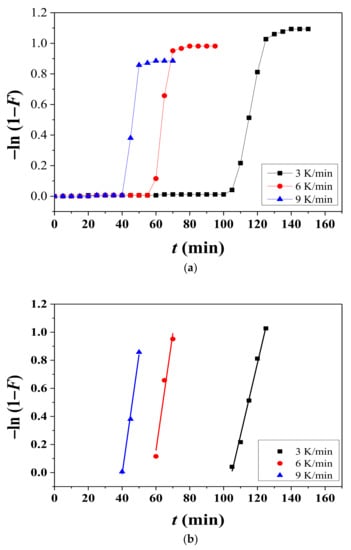 (a) Variations in −ln (1 − F) with t at heating rates of 3, 6, and 9 K/min at 593 K under 1.0 bar H2 for hydrided Mg–5Ni and (b) variation in −ln (1 − F) with t in the range where most of the hydrogen absorbed during hydriding is released.