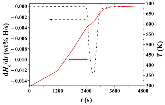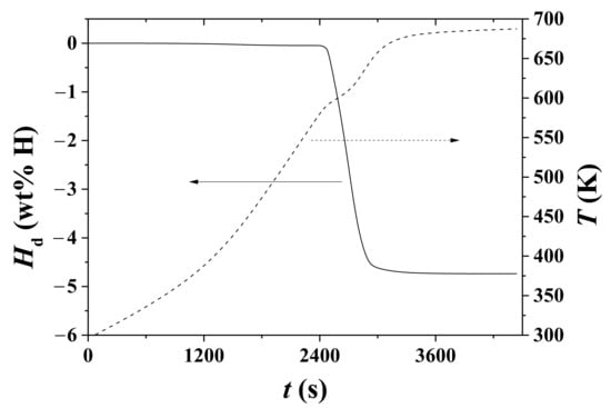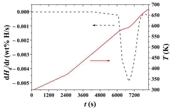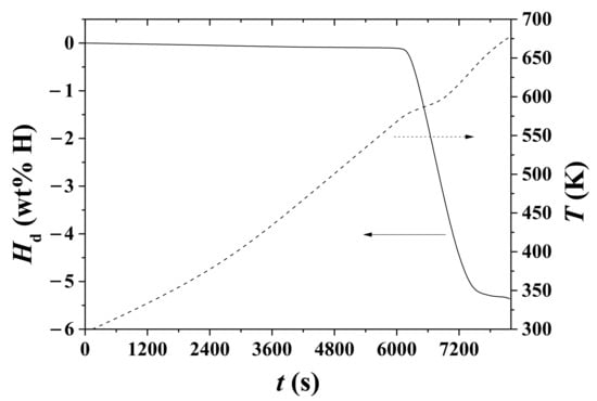 Variations in Hd and temperature T with t under 1.0 bar H2 for hydrided Mg–5Ni are shown in Figure 6. The sample was heated with a heating rate of 9 K/min. The sample begins to release hydrogen at 586.6 K (2441 s), releases hydrogen most rapidly at 606.3 K (2570 s), and releases hydrogen very slowly above 650 K (2921 s). Correspondingly, the rate of Hd change, dHd/dt, is the highest at 606.3 K.