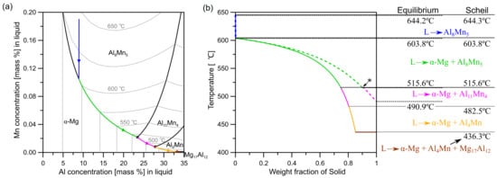 (a) Mg-rich corner of the Mg-Al-Mn liquidus projection calculated in Thermo-Calc software with the TCMG4.0 database. Coloured lines show the change in liquid composition during solidification of Mg-8.95Al-0.19Mn (wt.%). (b) Development of solid phases during solidification assuming equilibrium and the Scheil model. Colour indicates the solidification reactions in (a,b). ‘*’ indicates the reaction L + Al8Mn5 → α-Mg + Al11Mn4 during equilibrium solidification.