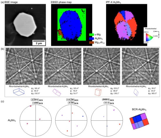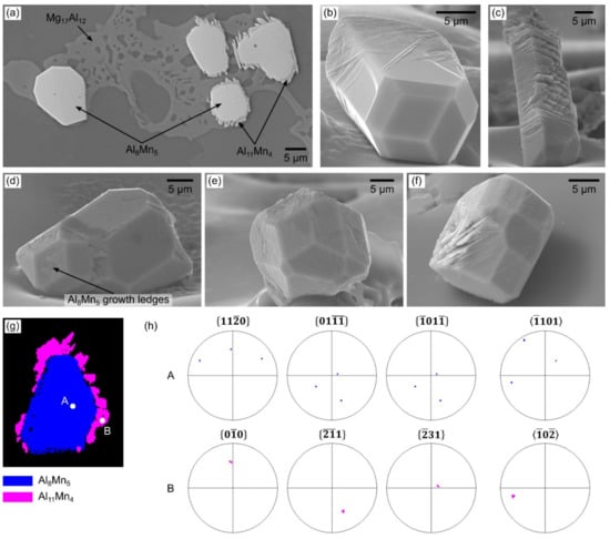 Past work has confirmed that the majority Al-Mn phase after casting of AZ91 is Al8Mn5 [23,24,26] and that it usually has the morphology of equiaxed particles or, more rarely, rods [23,24,31]. Zeng et al. identified that the equiaxed particles are cyclic twins [24]. Figure 3 shows a typical Al8Mn5 equiaxed particle in Mg-9Al-0.7Zn-0.2Mn. From the BSE image and the EBSD phase map in Figure 3a, it can be seen that Al8Mn5 grew as an equiaxed multifaceted polyhedral particle. According to the IPF-X orientation map, there were four orientations (colours) present in this single-phase particle with three clear linear interfaces.