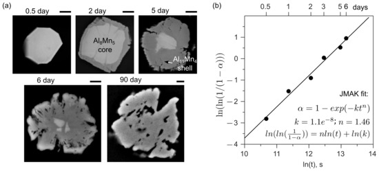 The analysis is plotted in Figure 5b. The data can be well-described by the JMAK equation with an exponent of ~1.5. This is discussed in terms of the solid-state reaction kinetics in core–shell transformations in [29]. A key feature in Figure 5 is that the transformation of Al8Mn5 into Al11Mn4 at 410 °C took approximately one week to complete, which is slow relative to the time to dissolve the Mg17Al12 into α-Mg (approximately one day in these samples).