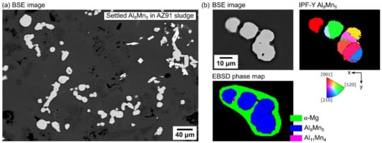 Direct observation in synchrotron radiography has confirmed that IMC particles can settle to the bottom of crucibles and form a sludge layer during either heating or solidification of AZ91 [28]. Figure 6 shows the SEM examination of a sludge sample from the bottom of an industrial HPDC holding pot of AZ91. It can be seen in Figure 6a that the settled IMC particles were agglomerated and formed clusters. In Figure 6b, the EBSD inspection identified that those IMC particles were Al8Mn5 occasionally with small Al11Mn4 plates on the surface. According to the IPF-Y orientation map, the two isolated Al8Mn5 particles (top left and middle) contain single or two orientations, whereas the agglomerated particle (bottom right) contains multiple orientations. The middle Al8Mn5 particle in the IPF-Y map followed the same twin OR as in Figure 3, although only two orientations were present. In the agglomerated particle, each two orientations (yellow and pink, green and orange, and red and blue) had the twin OR, i.e., three twinned Al8Mn5 were agglomerated. Multiple inspections found that 1–2 orientations were commonly observed in the settled Al8Mn5, and all had the twinned OR even though the number of twinned orientations per particle was less than four (as was typical of Al8Mn5 that was not in a sludge layer such as in Figure 3).