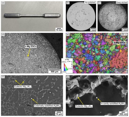 (a) HPDC AZ91 bar from Figure 1b. (b,c) Optical micrographs of the as-polished and deep-etched HPDC AZ91 showing the defects and the fine eutectic structure. (d,e) Externally solidified large α-Mg grain in (c) optical micrograph and (e) EBSD IPF-Y orientation map. (f,g) SE images of the eutectic Mg17Al12 and Al8Mn5 particles.