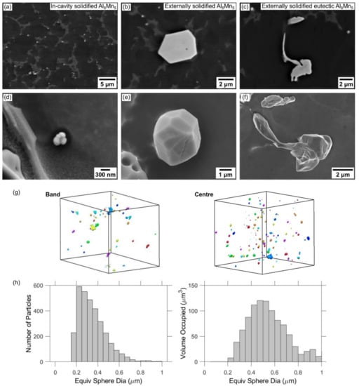 Figure 8a–f shows the microstructure of the in-cavity and externally solidified IMCs in the HPDC AZ91. In the cross-section BSE images, the in-cavity solidified Al8Mn5 particles were distributed near the eutectic Mg17Al12 network. They were 200–300 nm particles in size, such as that in Figure 8d. The externally solidified Al8Mn5 particles were equiaxed multifaceted polyhedrons around 2–5 µm and evenly distributed in the α-Mg matrix. In some externally solidified Al8Mn5, the rod-like Al8Mn5 grew from the equiaxed polyhedrons, as illustrated in Figure 8c–f. Figure 8g shows FIB tomography reconstructed images of Al8Mn5 particles in a volume of ~12 × 12 × 12 μm3 at two locations: the defect band and the center of the cross section. Each colour in the reconstructed images represents a unique particle. Figure 8h shows the size distribution of these Al-Mn particles in terms of the number of particles in each size bin and the volume occupied by particles in each size bin, for all studied locations combined. The great majority of particles in the plots are less than 1 μm in diameter, so these are the size distribution of the in-cavity solidified IMCs and there were no ESCs in the volumes sampled. Note that the particle number histogram appears to be truncated on the small diameter side, indicating that there are likely to also be a significant number of IMCs smaller than 200 nm that were not detected by this technique.