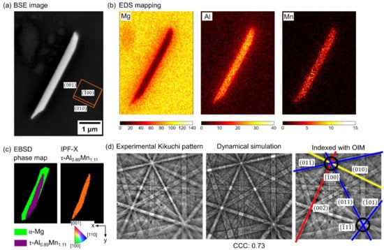 (a) BSE image of the meta-stable phase τ-Al0.89Mn1.11 in the HPDC AZ91. (b) EDS mapping, (c) EBSD phase map and IPF-X orientation map of the phase. (d) Experimental Kikuchi pattern and dynamical simulation with cross-correlation coefficient (ccc) and indexed crystal planes and directions.
