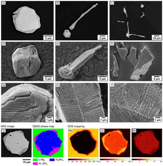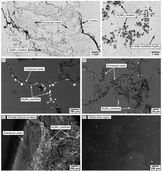 Figure 10f overviews the microstructure of a normal region of the AZ80 billet shown in Figure 1c. Compared with Figure 10a–e, it can be seen that the Al-Mn IMCs were evenly distributed in the α-Mg matrix when entrained oxide was absent. Note that eutectic Mg17Al12 was absent at the grain boundaries as the AZ80 has been solution heat-treated.