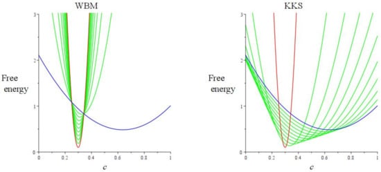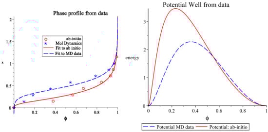 The reader can obtain a detailed discussion of the effect of interpolating functions in [15]. A derivation of the above Equations is given in [14], where an application of the method to real data is shown in Figure 2. Here, the transition in space from liquid (unstructured) to solid (structured) is over a distance δ , normalised to unity. Note that it is more convenient to represent the space variable, X, as a function of the phase variable, ϕ , so that Equations (15) and (16) can be applied directly. We observe that the near sigmoid shape of the molecular dynamic computed points (blue asterisk in the left of Figure 2) results in a near standard-looking double-well potential, approximately proportional to ϕ 2 ( 1 ϕ ) 2 , but the ab initio data leads to a double-well skewed significantly towards the solid.