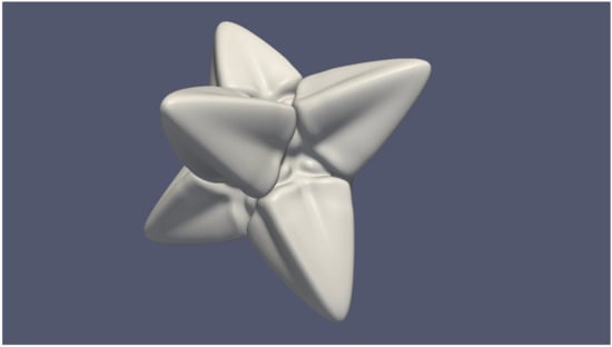 The effect of this example of A is to give a small preferential growth direction along the Cartesian x and y axes. When the driving force is strong, this results in highly directional growth—dendrites (see Figure 3 illustrating 3D growth using an extension of Equation (19), shown below as