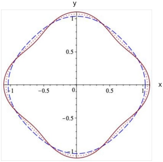 Figure 4. A polar plot of the anisotropy function Equation (19) for a range of values: ϵ = 1 / 30 ,1/15,1/10. These are, respectively: dashed blue; dotted red; and solid brown. For values of ϵ < 1 / 15 , the polar plot has positive curvature, but for values of ϵ > 1 / 15 , the plot develops points of inflection.