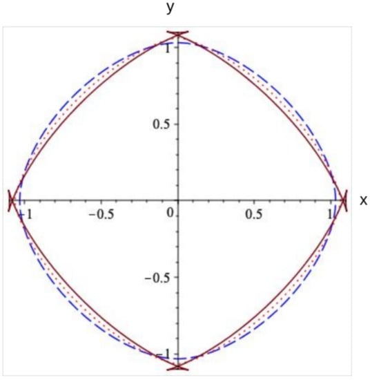 Figure 5. A Wulff plot of the anisotropy function Equation (19) for a range of values: ϵ = 1 / 30 ,1/15,1/10. These are, respectively: dashed blue; dotted red; solid brown. For values of ϵ < 1 / 15 , the Wulff shape is continuous, but for values of ϵ > 1 / 15 m the plot develops cusps (in the solid brown line).