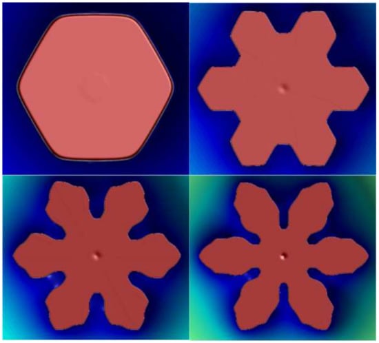 This has not prevented some researchers from using values of ϵ 1 / 15 , with some stabilisation techniques in order to simulate faceted growth [18,19,20]. After first following standard literature to explore the growth of a regular hexagon in [21], the transition from pure faceted to dendritic morphology was investigated. Figure 6, reproduced from this paper shows the progressive effect of increasing undercooling from near equilibrium (regular polygon) to high undercooling (multifaceted—snowflake-like in appearance). The paper observes that, for higher undercooling, the transition for circular seed always passes through a polygon stage on the way to multifaceted. The paper thus addresses the question as to whether there is a cut-off undercooling for which at any smaller undercooling the polygon is the end state—no matter how long the simulation time. The answer argued is, yes, such a cut-off exists.