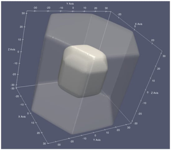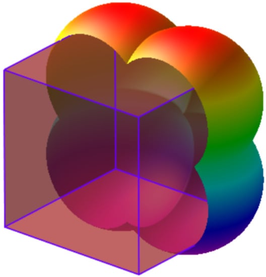 where p i are the n vertices of the resulting required equilibrium morphology. The quantity, n ϕ / | ϕ | is the normal to the surface, and so when the normal is in the same direction as one of the vertices, say, p 3 , then A takes on the magnitude of p 3 . For 2D shapes, A becomes a function of angle, θ , and it is seen to be a series of connected circular arcs that pass through the vertices and meet on each facet. In 3D, the surface energy is generalised to a series of connected spheres (see Figure 7), being an application of Equation (25) with the vertices of a cube, p i , i = 1 8 serving to define A.