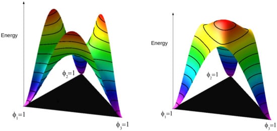 The other feature present in our model (the right of Figure 16) is that the gradient of surface energy is zero at the boundary of the simplex, but this is not the case in the models advocated in [30,31]. A low triple junction barrier generates a spurious phase at a binary junction. The model advocated in [32] avoids both spurious phase generation and also, due to the zero gradient, does not give preference to a value outside the simplex, i.e., non-physical negative values of ϕ i . It is interesting to note that the use of a potential well known as the double obstacle, given by