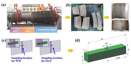 Gas turbine rotor and toughness test sampling: (a) the actual rotor after 14 years of service and its three parts; (b) the materials cut from the turbine part and the compressor part; (c,d) the sampling process and the dimensions (in mm) of the standard Charpy V-notch impact test specimens.